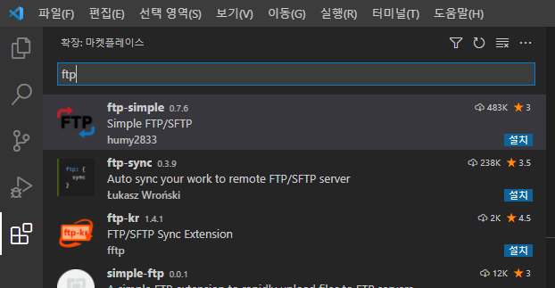 확장 탭에서 "ftp-simple"를 검색하고 설치합니다.
