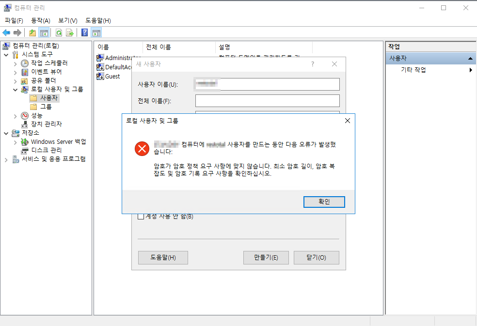 윈도우 신규 계정 생성 시 아래와 같은 오류 메시지가 뜰 경우 아래와 같이 보안정책 완화할 수 있다.
