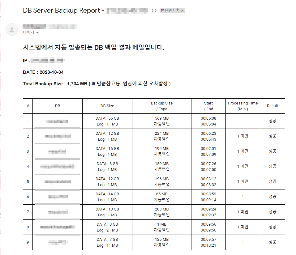 3. 백업 후 남겨진 기록과 msdb.dbo.backupset 테이블 데이터를 참조하여 리포팅 메일 발송.